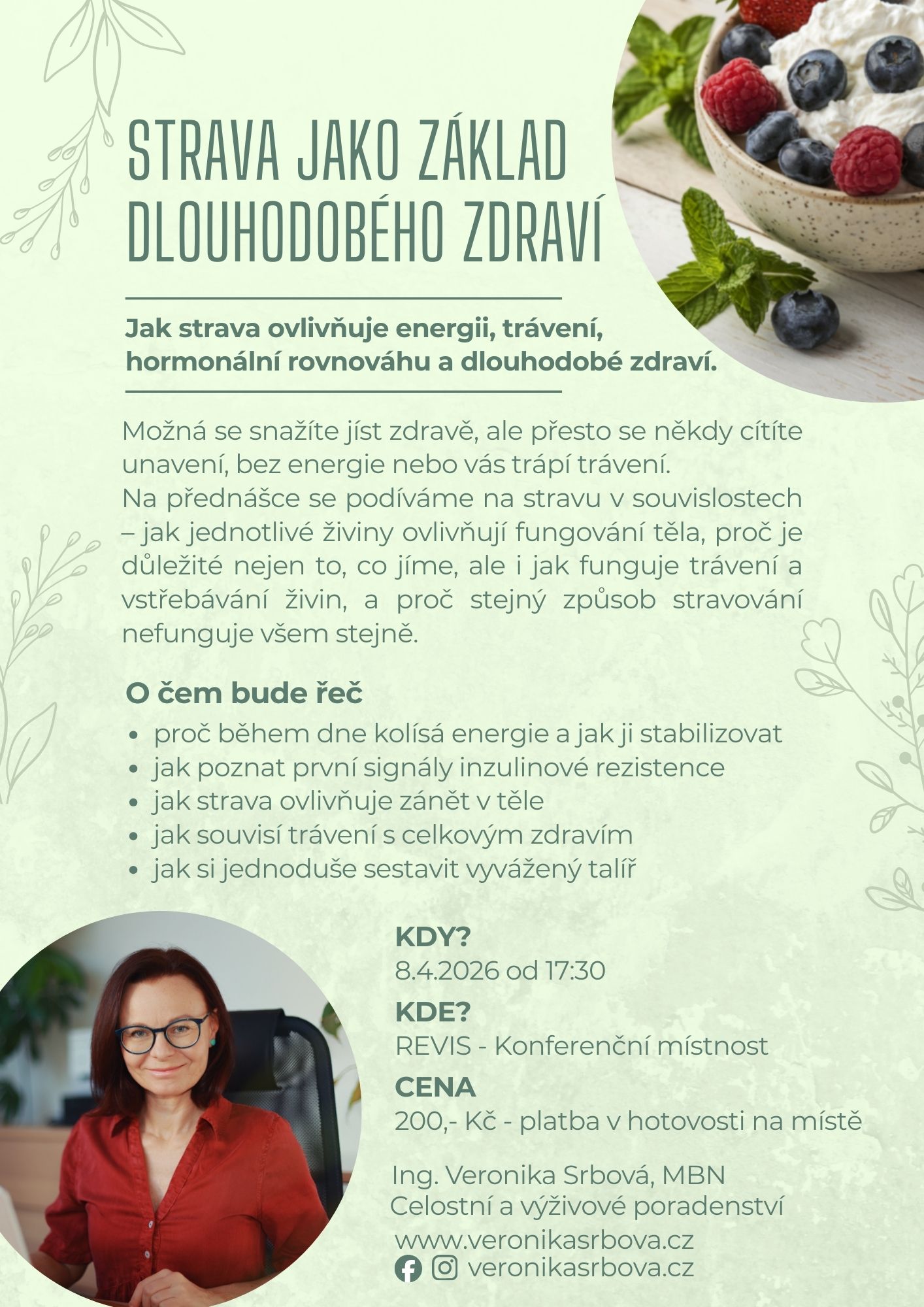 Budeme mluvit také o tom, jak strava ovlivňuje zánět v těle, kolísání krevního cukru a vznik inzulinové rezistence – tedy stavů, které často stojí na pozadí mnoha chronických onemocnění.